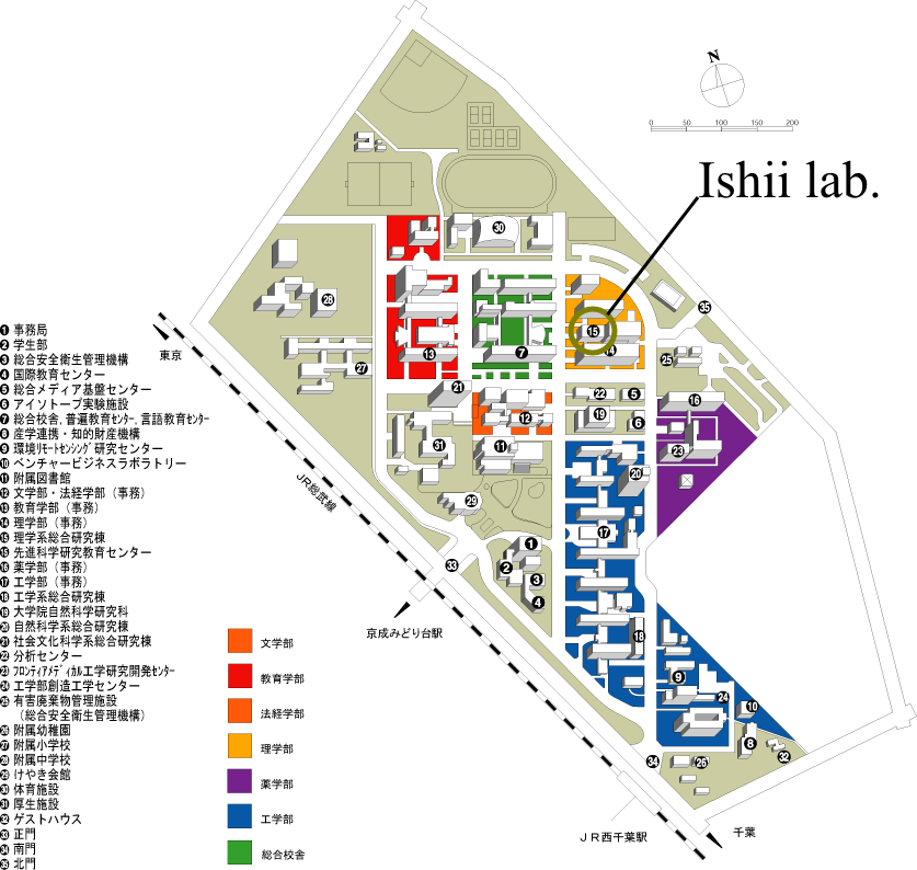 千葉大学 西千葉キャンパス 理学部2号館2階 下図15番、別称「理学系総合研究棟」。サイエンスプロムナードのある建物です 学生室(207号室) Tel & Fax: 043-290-3004